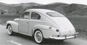 Volvo PV 444 (1947) – 4 cylindry, 40 KM i 4 osoby, właśnie to oznacza ten skrót. „PV” to po prostu samochód osobowy. Pod samonośnym nadwoziem ukryto mechanizmy z końca lat 30-tych, ale wraz z rozwojem konstrukcja otrzymała wiele „nowości”. Na rok przed końcem produkcji otrzymał pasy bezpieczeństwa (1957 rok). Volvo to bezpieczeństwo.